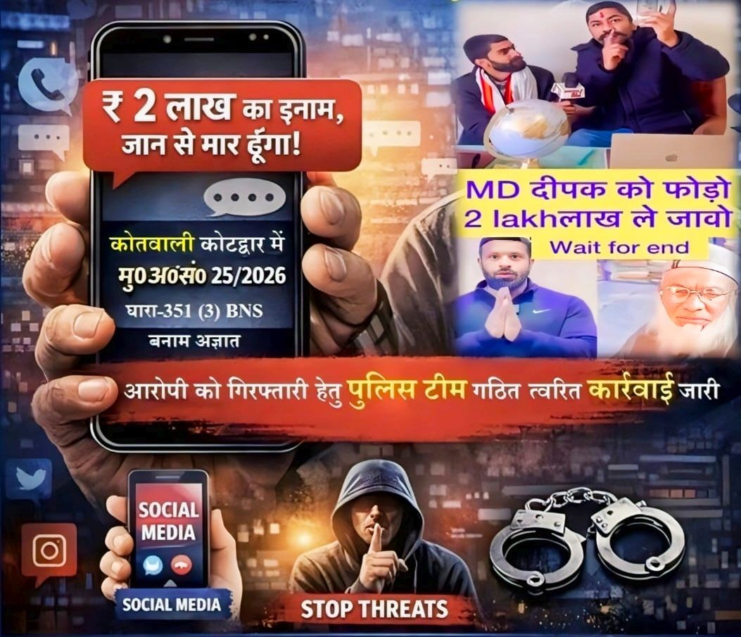 जानकारी के अनुसार बीते रोज दीपक कुमार, निवासी कोटद्वार द्वारा कोतवाली कोटद्वार में शिकायती पत्र देकर बताया गया था कि किसी अज्ञात व्यक्ति द्वारा सोशल मीडिया के माध्यम से उनको मारने के संबंध में 2 लाख रूपये का इनाम देने की धमकी दी गई है।