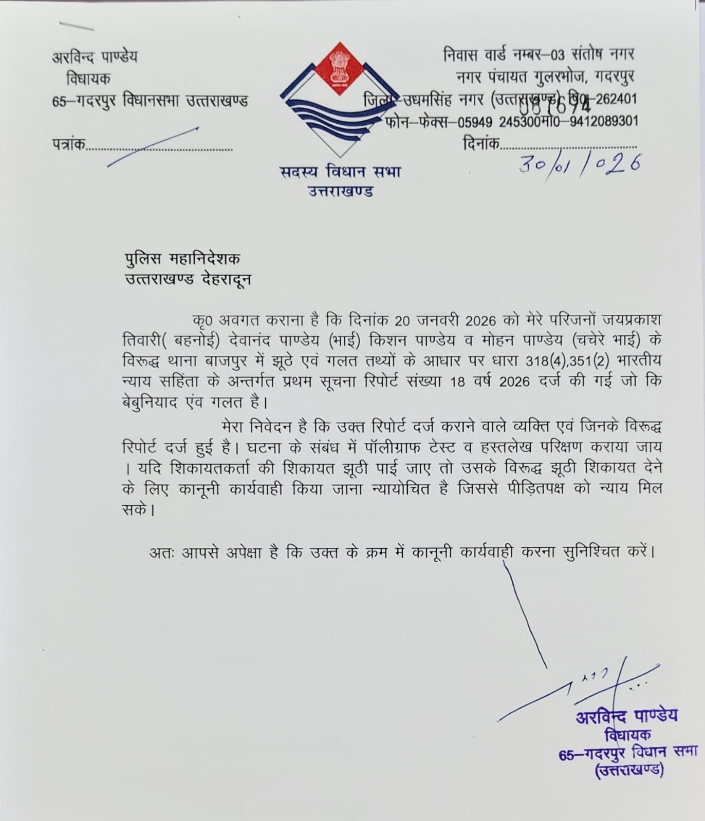 आज यहां विधायक गदरपुर अरविन्द पाण्डे ने पुलिस महानिदेशक दीपम सेठ से मिलने के बाद पत्रकारों को जानकारी देते हुए बताया कि 20 जनवरी को उनके व उनके परिवार के जयप्रकाश तिवारी (बहनोई), देवानंद पाण्डेय (भाई), किशन पाण्डेय, मोहन पाण्डेय (चचेरे भाई) के खिलाफ थाना बाजपुर में झूठे एवं गलत तथ्यों के आधार पर धारा 318(4), 351 (2) भारतीय न्याय सहिंता के अन्तर्गत प्रथम सूचना रिपोर्ट दर्ज की गयी जो कि बेबुनियाद एवं गलत है। कूचटरचित प्रमाण पत्र बनाने व जान से मारने की धमकी देने का मुकदमा भी दर्ज हुआ है। उन्होंने पुलिस महानिदेशक से मांग की है उनके व उनके परिवार के लोगों की जांच हो और दोनों पक्षों (उनका व मुकदमा दर्ज कराने वाले) की पॉलीग्राफ टेस्ट कराया जाये। अगर उनका परिवार दोषी है तो उनको जेल भेज दें। उन्होंने कहा कि यदि शिकायतकर्ता की शिकायत झूठी पायी जाये तो उसके विरूद्ध झूठी शिकायत देने के लिए कानूनी कार्यवाही किया जाना न्यायोचित है जिससे पीडित पक्ष को न्याय मिल सके। उन्होंने कहा कि यह केन्द्र की व्यवस्था है कि अगर किसी राजनेता पर कोई आरोप लगते हैं दो उसकी जांच शीघ्र अति शीघ्र करायी जाये। उन्होंने कहा कि उनके 30 साल के राजनैतिक जीवन में उनपर कोई आरोप नहीं लगे हैं लेकिर अब जो उनपर मुकदमा दर्ज हुआ है तो उनके व उनके परिवार व मुकदमा लिखाने वाले का पॉलीग्राफ टेस्ट कराया जाये यहीं नही अभिलेखों की जांच करायी जानी चाहिए। उन्होंने कहा कि किसान सुखवन्त सिंह आत्महत्या मामले की भी सीबीआई जांच करायी जाये।