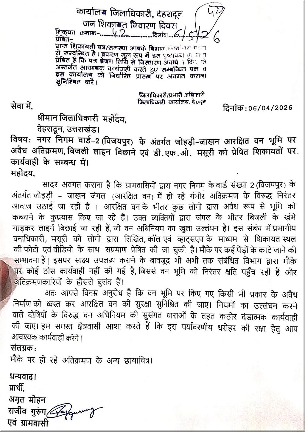 देहरादून। नगर निगम वार्ड—2 (विजयपुर) के तहत जोहड़ी—जाखन के आरक्षित जंगल में अवैध कब्जे का मामला गरमा गया है। ग्रामवासियों ने आरोप लगाया है कि कुछ लोग जंगल की जमीन पर कब्जा जमाने के लिए बिजली के खंभे गाड़कर लाइन बिछा रहे हैं। स्थानीय लोगों का कहना है कि वन विभाग को लिखित शिकायत, फोटो और वीडियो सबूत देने के बावजूद अब तक कोई ठोस कार्रवाई नहीं हुई। वहीं जंगल में पेड़ों के कटने की आशंका भी जताई जा रही है। ग्रामीणों ने जिलाधिकारी से तुरंत हस्तक्षेप कर अवैध निर्माण हटाने और दोषियों पर सख्त कार्रवाई की मांग की है।