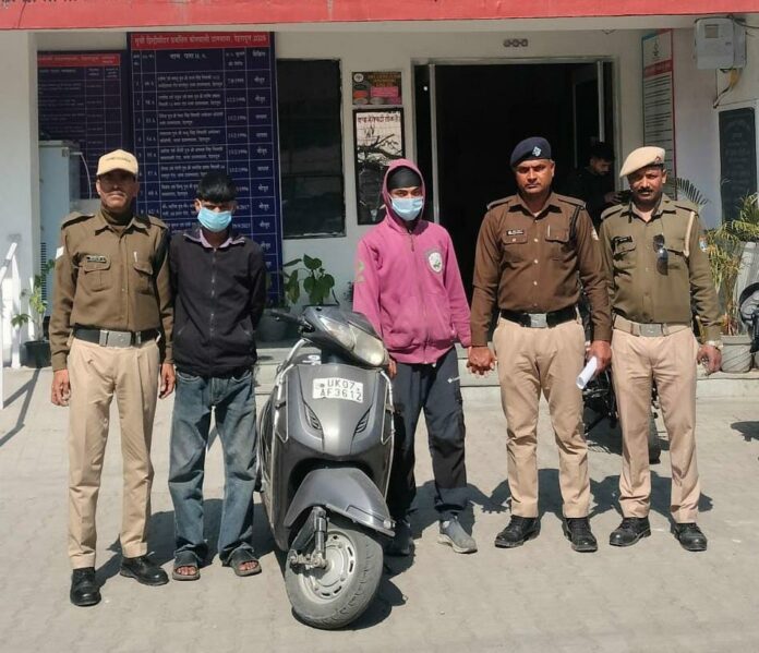 देहरादून। स्कूटी चोरी मामले का खुलासा करते हुए पुलिस ने दो शातिरों को गिरफ्तार कर लिया है। जिनके पास से चुरायी गयी स्कूटी बरामद हुई है।